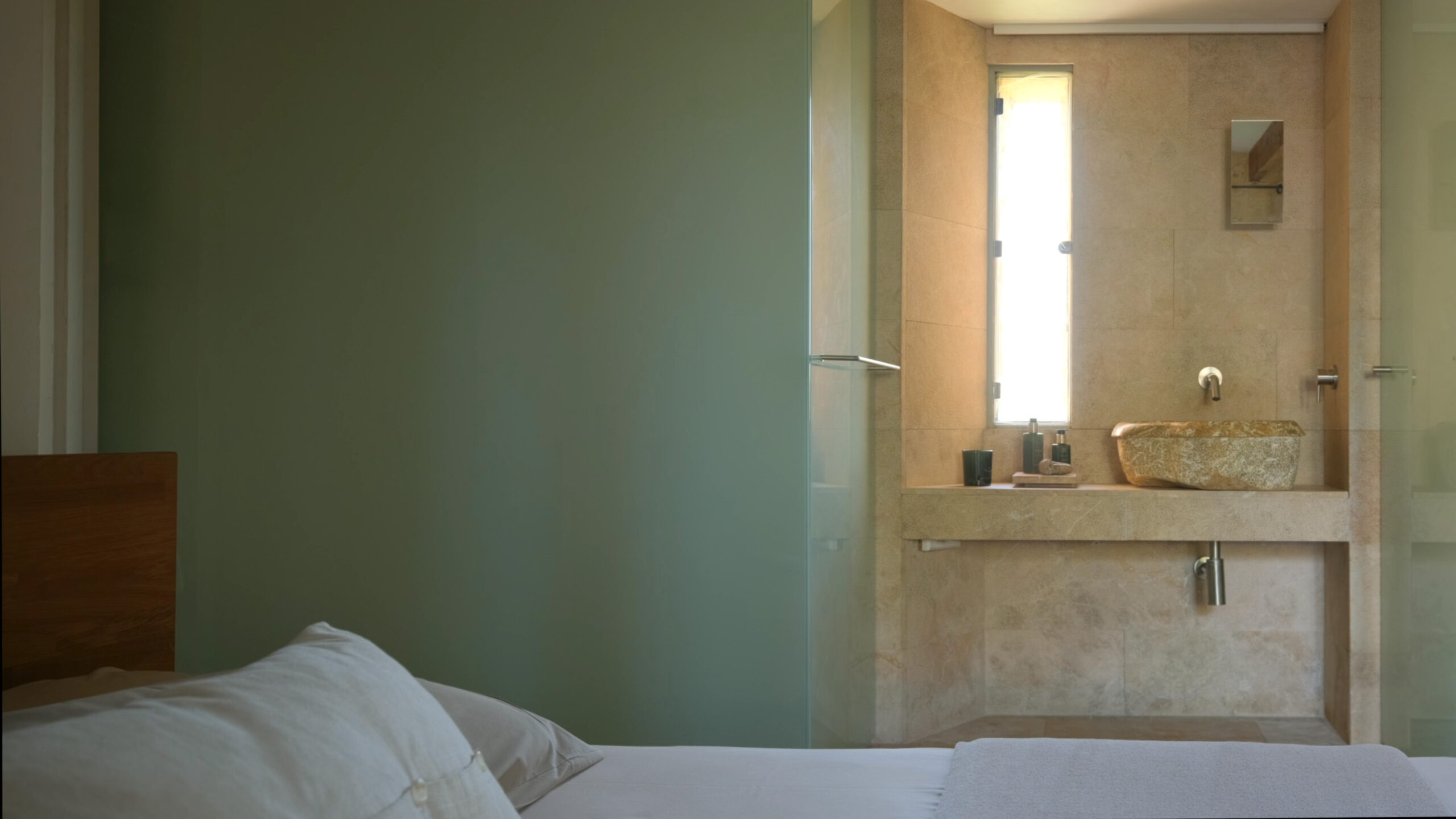 The house has 4 bedrooms, two downstairs and two upstairs. All bedrooms have double beds. The upstairs bedrooms have en-suite bathrooms and overlook the pool. The downstairs bedrooms share a bathroom and overlook the garden.