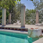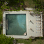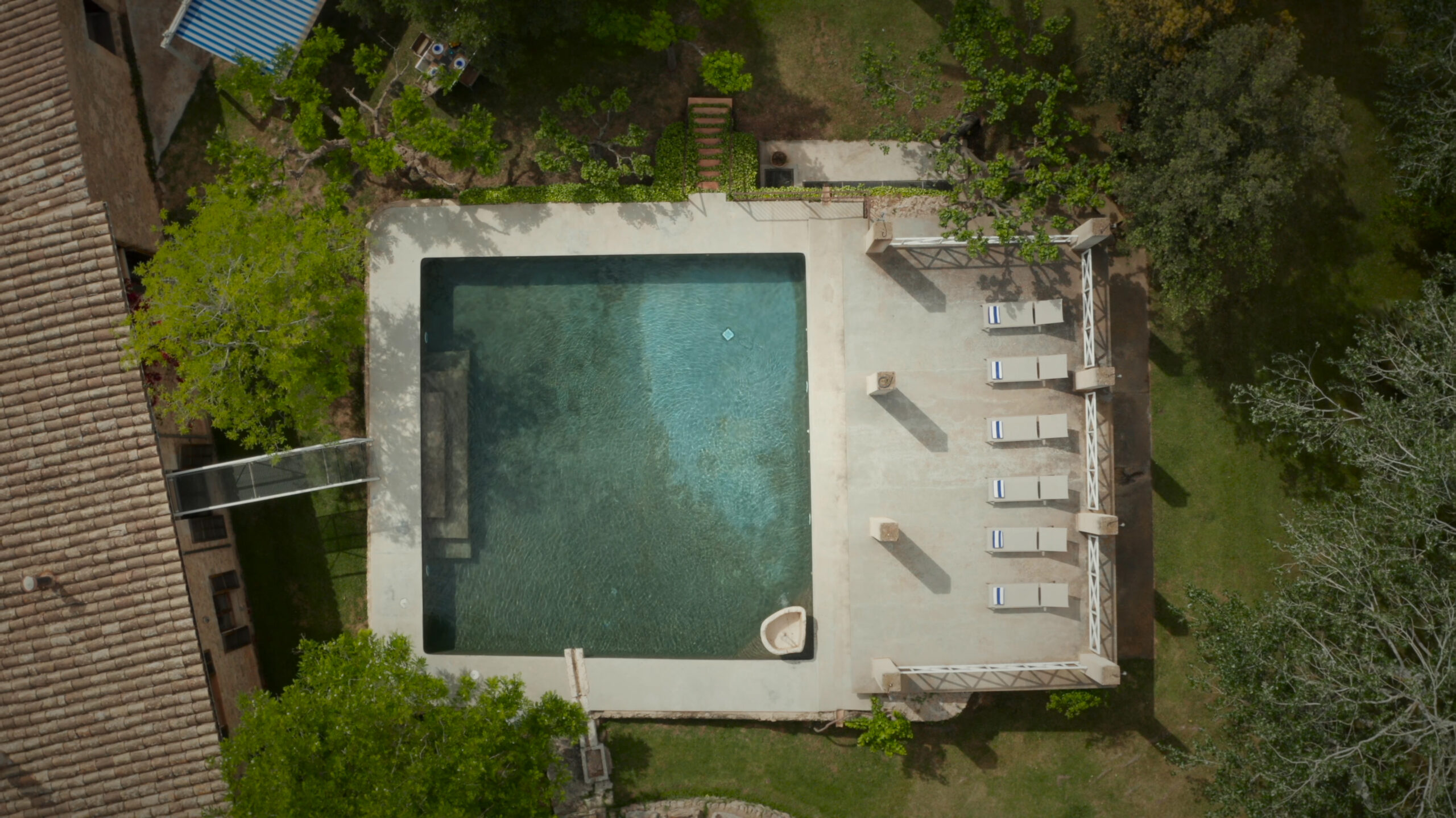 The property has a large outdoor swimming pool with space for sunbathing. Below the pool is a covered area with a toilet and outdoor furniture.